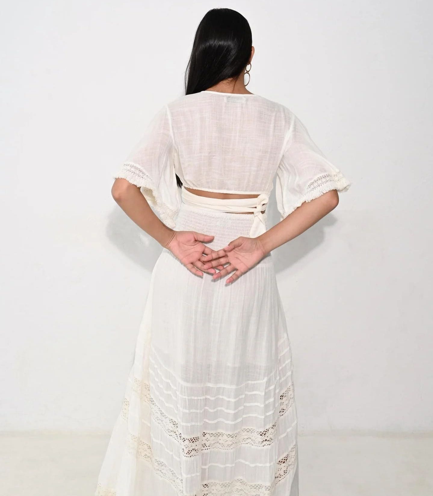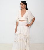 Este conjunto transmite una sensación de libertad y frescura, ideal para los días cálidos y las noches de verano, gracias a su color blanco. El diseño comienza con un top cruzado con escote en V. Las mangas cortas y acampanadas están adornadas con delicados bordados y detalles de encaje. El top se acompaña de una falda de cintura alta.
