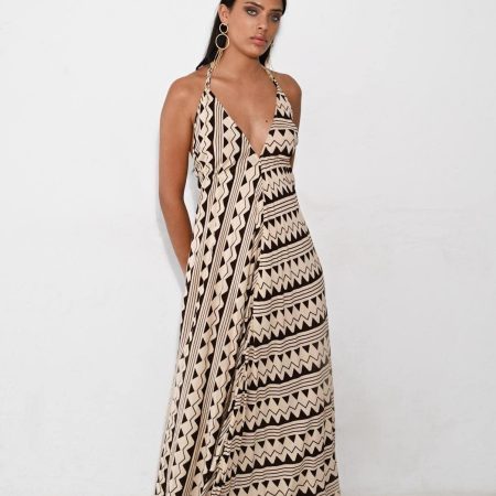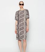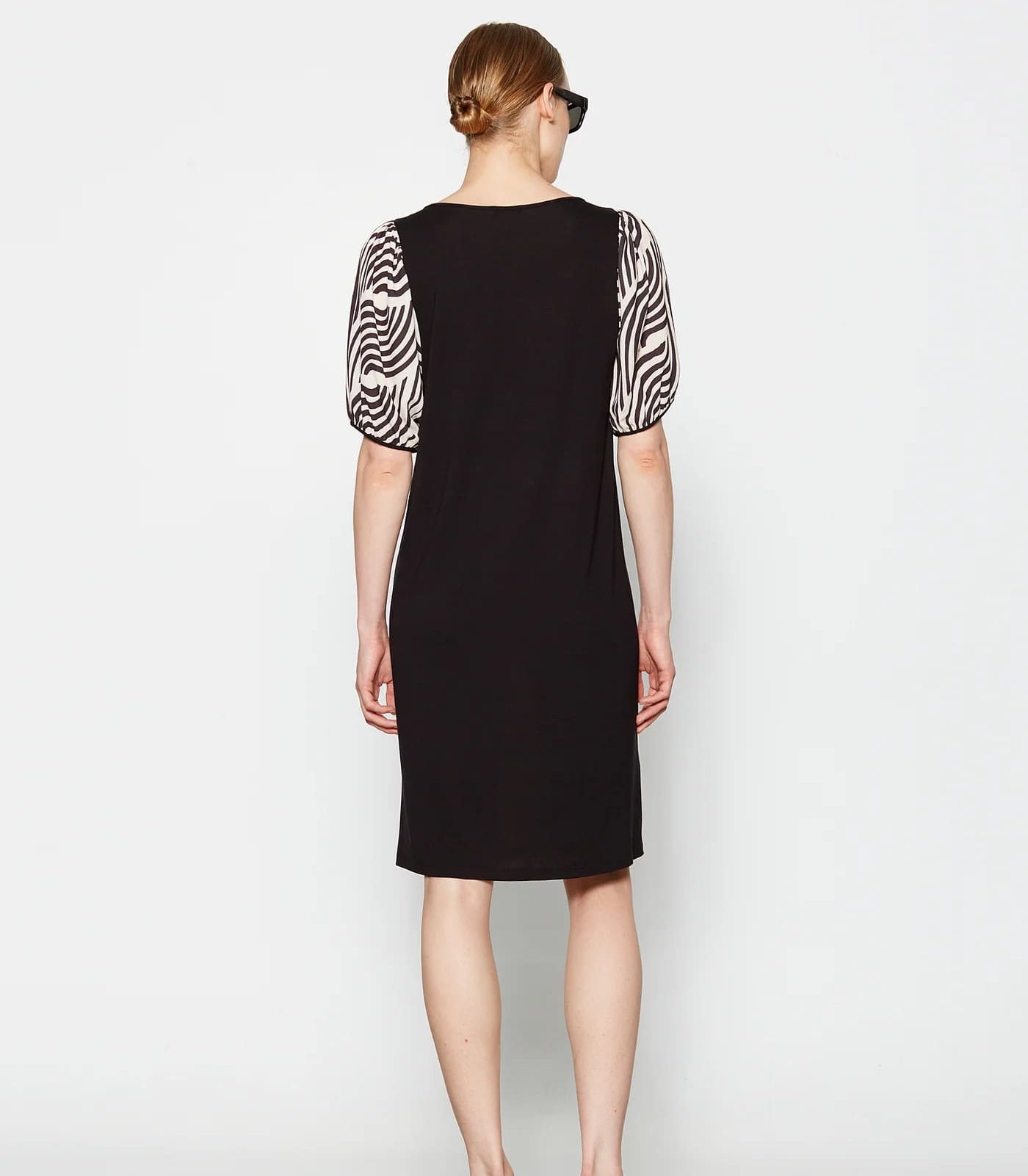 Vestido cuello barca y manga abullonada. Delantero estampado y espalda lisa de punto circular.