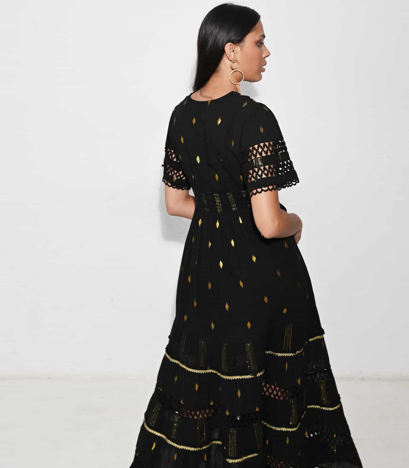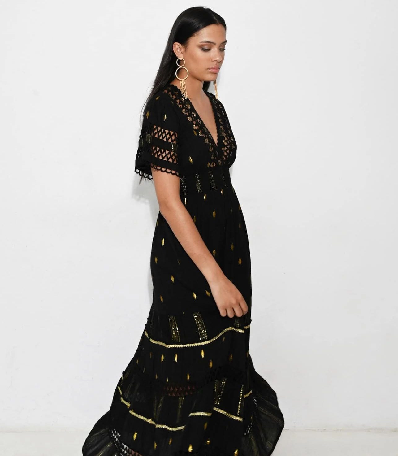 Este elegante vestido largo, con una base negra profunda, se adorna con pequeños detalles dorados que añaden un toque de brillo. Cada detalle, desde el patrón geométrico en el corpiño hasta las delicadas franjas en la falda, ha sido cuidadosamente diseñado.